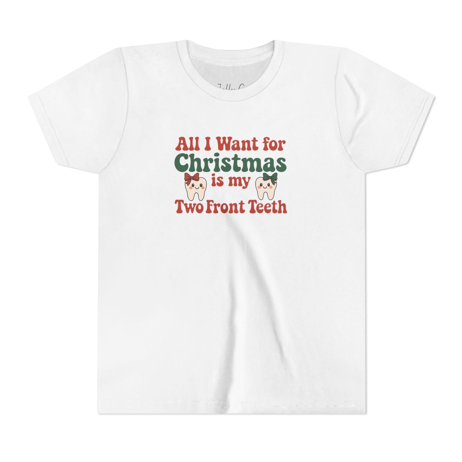 | A classic “All I Want for Christmas Is My Two Front Teeth” kids tee made for laughs, photos, and Christmas spirit. Printed on a Bella Canvas kids shirt, DTG printed for softness and durability. |